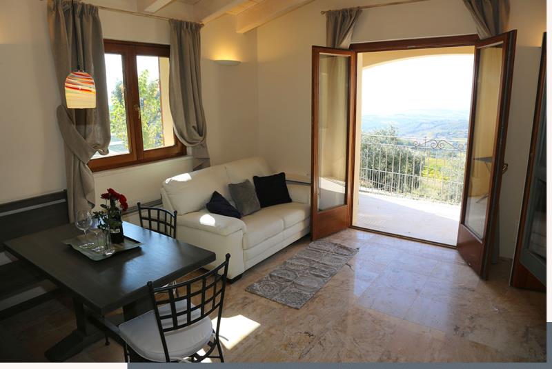 Upstairs you enter a bedroom with a double bed, or two separate beds (on request).The living room leads to a lovely outdoor area with a wonderful valley-view in the green heart of Chianti.